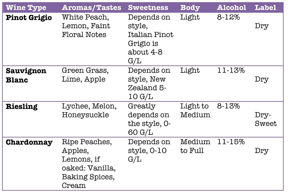 Below are the 4 most common white wine varietals North Americans drink, all of them can be made in “dry” styles, and all of them have some sugar in them.